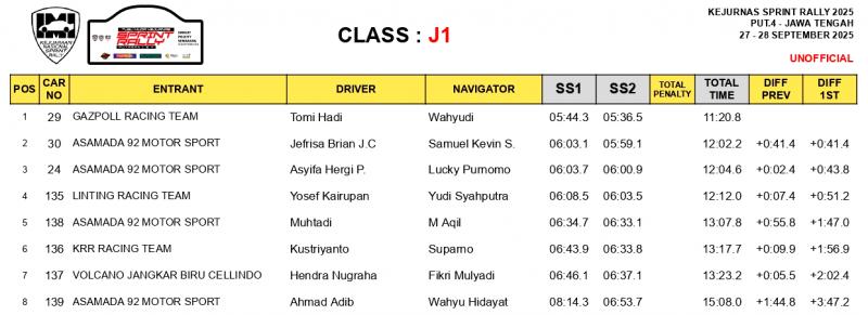 Tomi Hadi berhasil navigatornya Wahyudi atau yang akrab disapa Yudi Babal berhasil memimpin klasemen sementara di Kelas J1 dengan selisih waktu yang sangat signifikan, nyaris tak tersentuh oleh para pesaingnya.