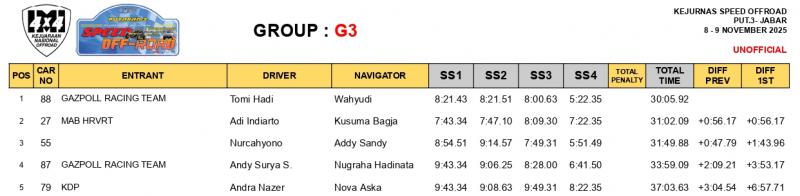 Duet Tomi Hadi / Wahyudi mengukir total waktu tempuh tercepat dengan akumulasi 30 menit 05.92 detik dari 4 Special Stage (SS) yang dilalui. Kemenangan ini menunjukkan keandalan mobil dan strategi Gazpoll Racing Team di tengah ketatnya persaingan di Grup G3.