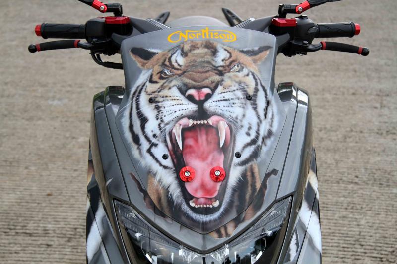 Ya benar, bukan macan beneran, melainkan Yamaha Nmax lansiran 2016 yang sudah dimodifikasi dengan balutan airbrush motif macan.