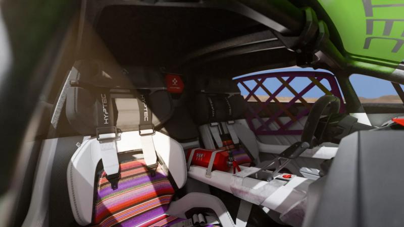 Pintu butterfly terbuka untuk memperlihatkan kokpit minimalis dengan roll cage dan jok sport bergaya, mengingatkan desain Recaro CS Spectrum masa lalu. Namun, bagian tengah jok ini memiliki sentuhan unik yang terinspirasi dari selimut tradisional Meksiko, serape.