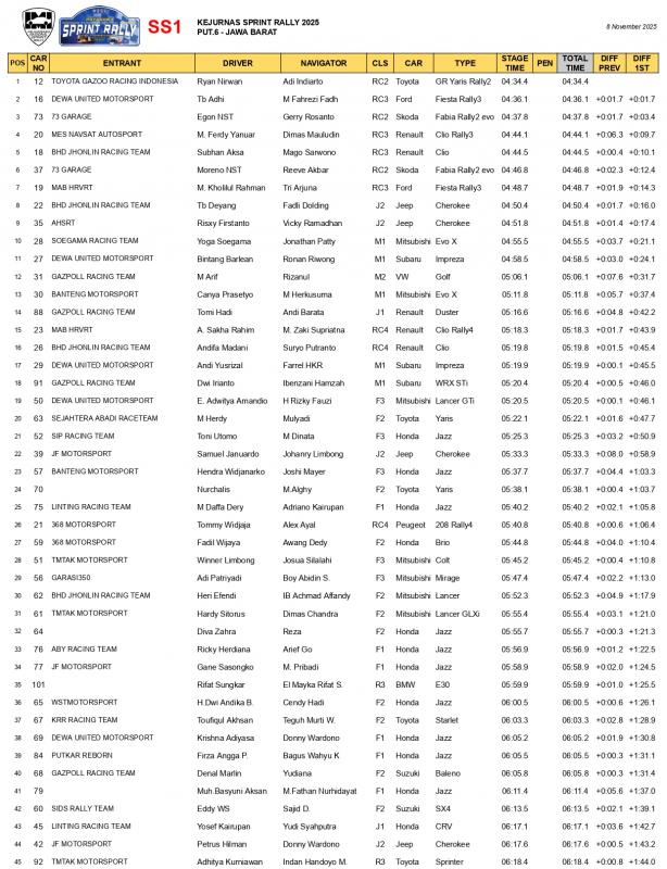 Ryan Nirwan dari Toyota Gazoo Racing bersama navigatornya Adi Indiarto, tampil tercepat pada SS1, mengendarai Toyota GR Yaris Rally2 (kelas RC2). Secara overall, pasangan yang tengah mengunci gelar juara nasional ini mencatatkan waktu total tercepat 04:34.4.