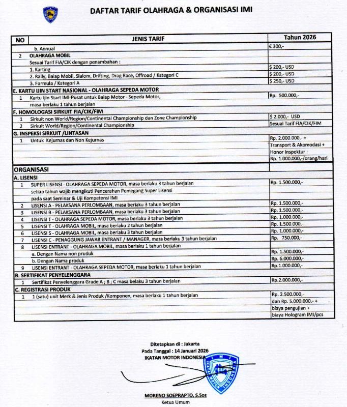 Melalui Surat Keputusan Ketua Umum Nomor 027/IMI/SK-ORGAN/A/1/2026, Moreno Soeprapto selaku Ketua Umum menetapkan rincian tarif biaya administrasi terbaru yang mencakup sektor olahraga dan organisasi untuk tahun berjalan 2026.