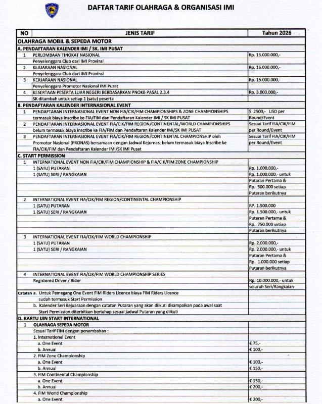 Dalam aturan baru tersebut, IMI membagi struktur biaya secara mendetail mulai dari pendaftaran kalender balap, perizinan atlet, hingga sertifikasi perangkat pendukung olahraga motor.
