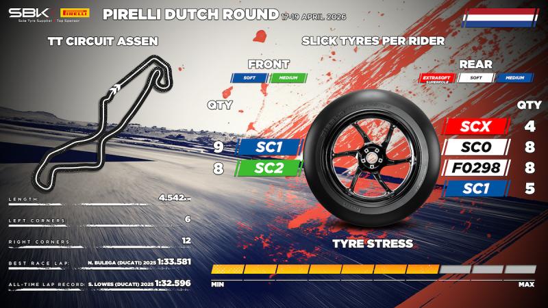 Menyadari reputasi Assen yang sering diguyur hujan pada periode tahun ini, Pirelli juga telah menyiapkan ban DIablo Wet untuk kondisi lintasan yang lembap (intermediate) serta Diablo Rain untuk skenario hujan deras.